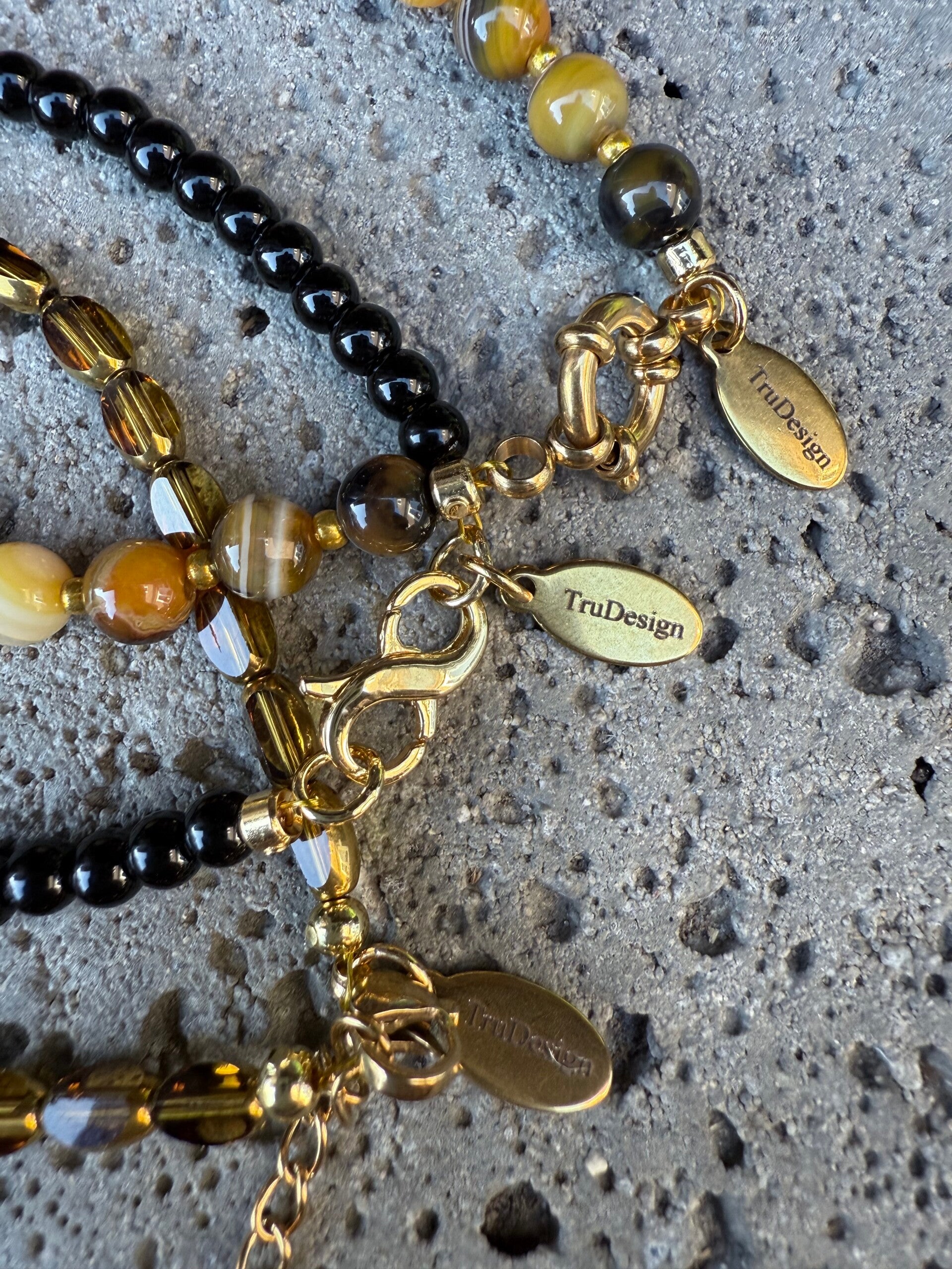 Warme aarde- en honingkleuren, glanzende bandagaatkralen — de Spirit-armband ademt de rust van Ameland en de kracht van eenvoud.