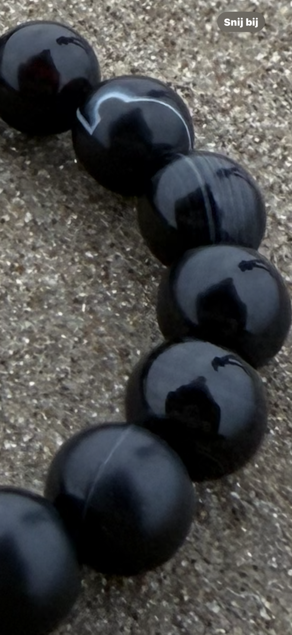 Diepe zwarte agaat met subtiele lijnen geven deze armband een stille intensiteit — niet glimmend of luid, maar mannelijk, strak en vol karakter.