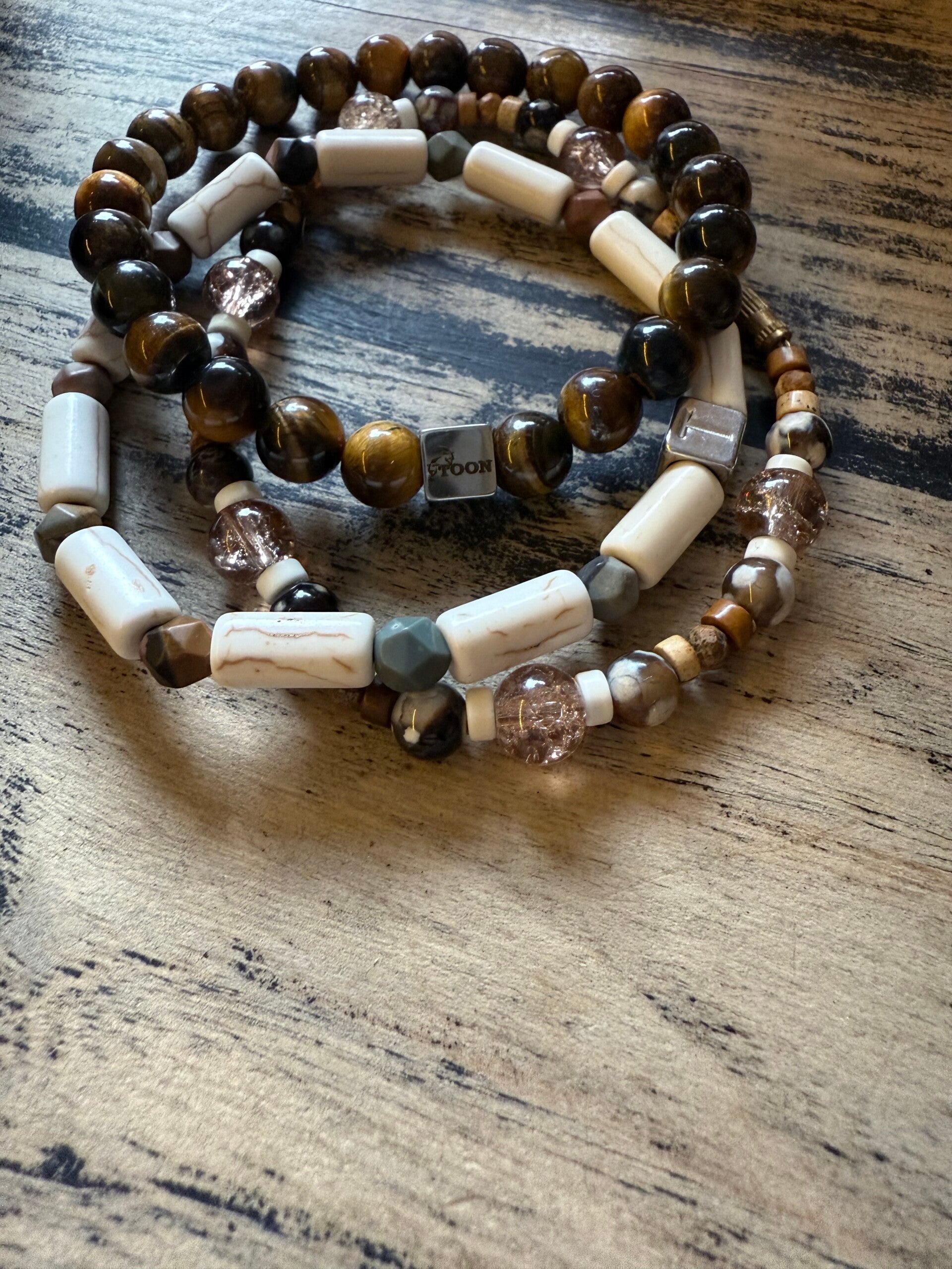 De gele tijgeroogstenen versterken dat gevoel van alertheid en beweging.