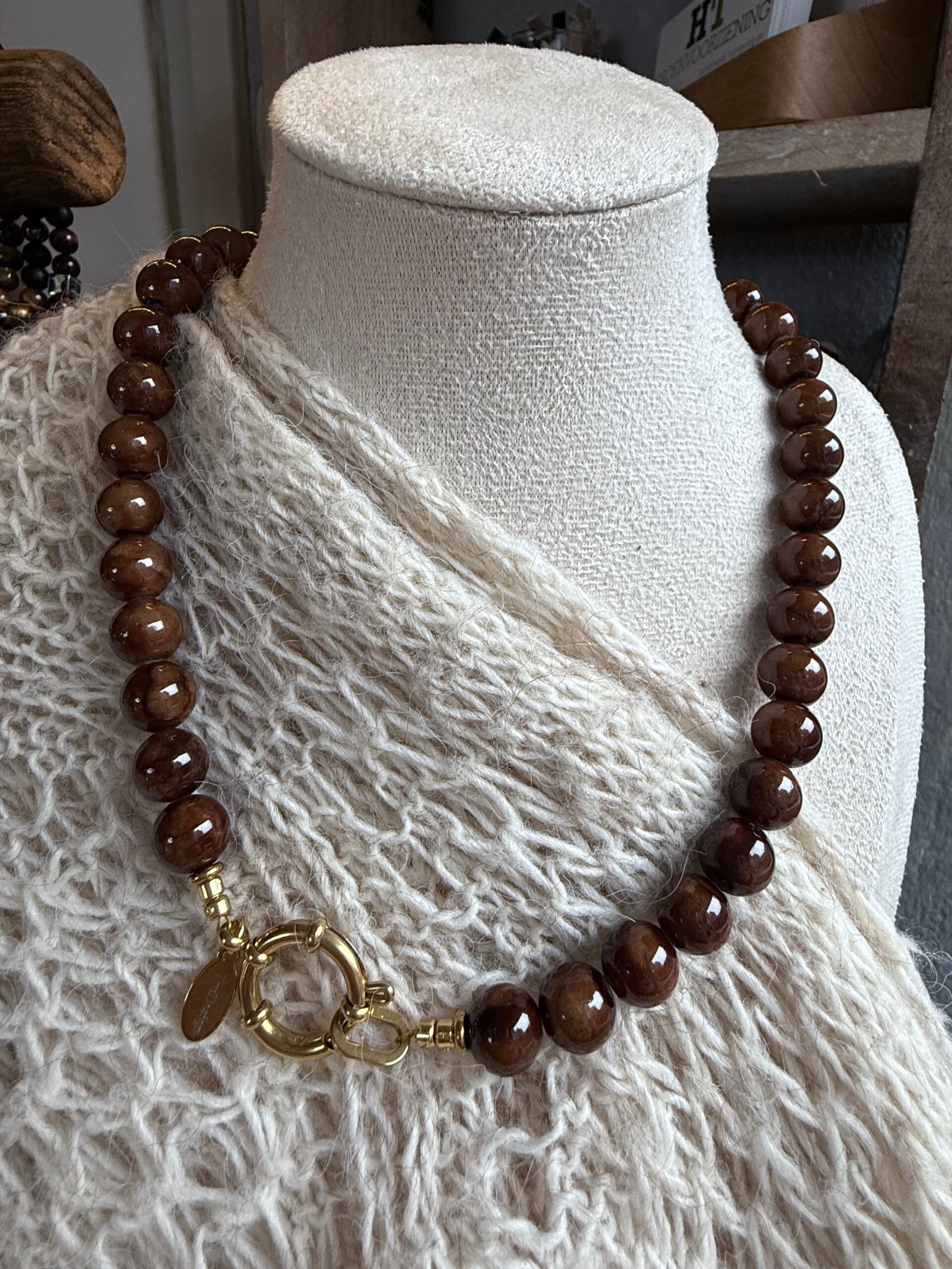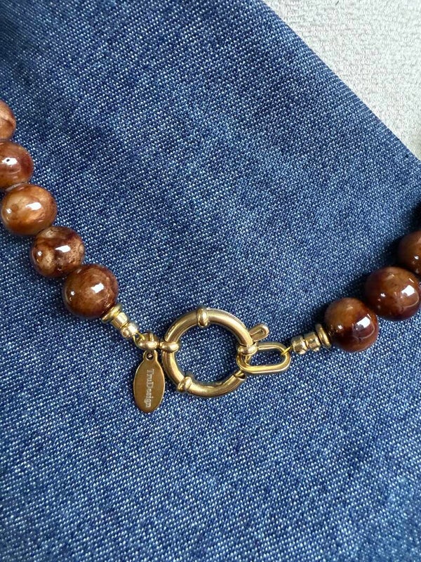 The Coffee Glow Necklace is gemaakt met 8mm, hoogglans geverfde agaatkralen in een diepe koffietint — elk steentje met zijn eigen tekening en karakter.