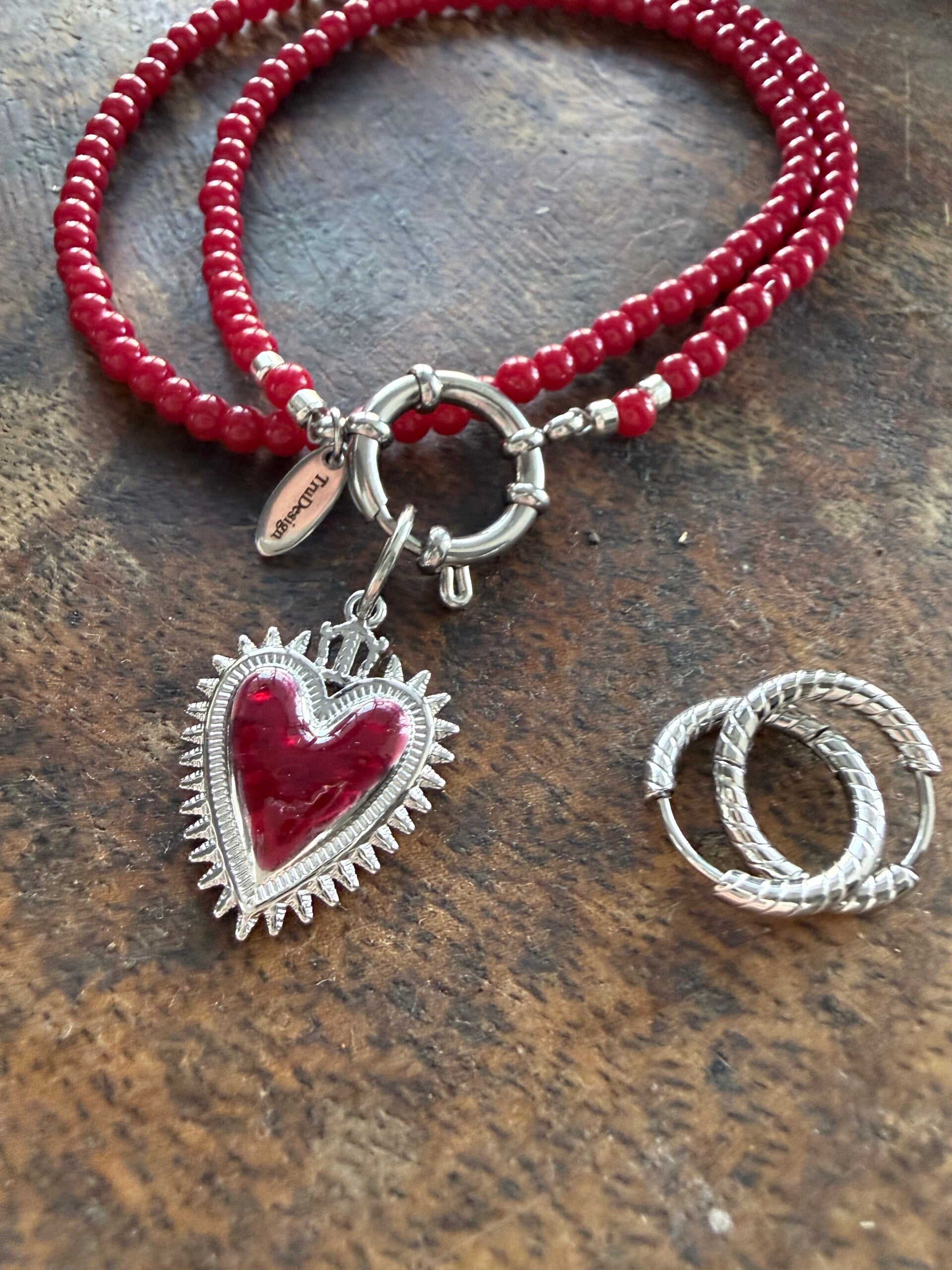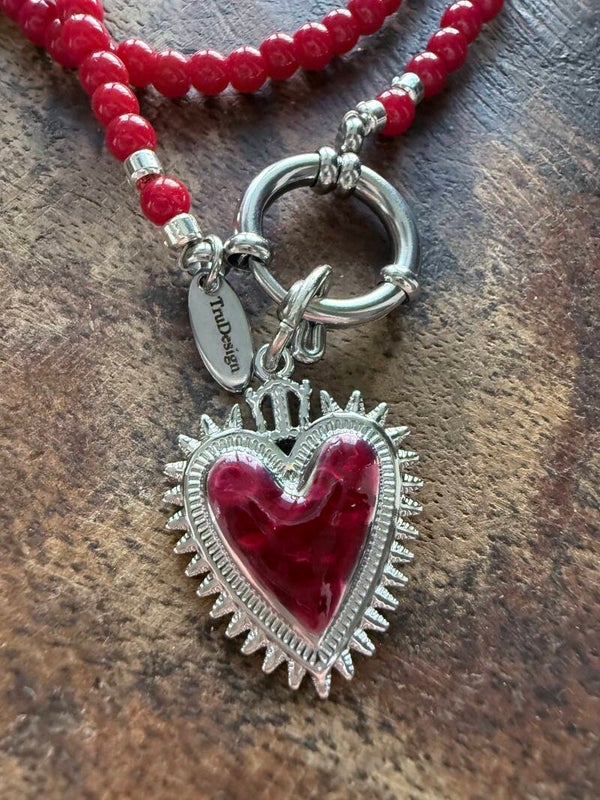 Koraalrood, zichtbaar en vol karakter. Geen zoete symboliek, maar een sieraad dat staat voor kracht en gevoel.